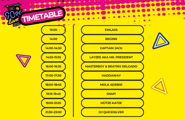 Am 5. Juli 2025 wird der Wiley Sportpark in Neu-Ulm zum Schauplatz eines unvergesslichen Spektakels: Die 90er Open-Air-Party bringt die größten Stars und Hits der 90er-Jahre auf die Bühne. Mit Haddaway, Snap!, Mr. President, Captain Jack, Masterboy und DJ Mola Adebisi erleben Fans die größten Legenden dieser Kult-Ära live. Ein einzigartiger Abend voller Nostalgie, Energie und Party-Garantie erwartet dich!