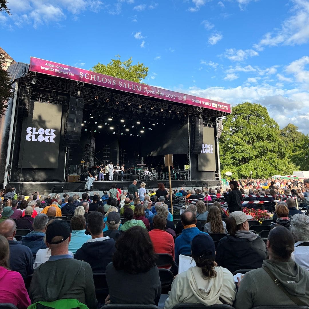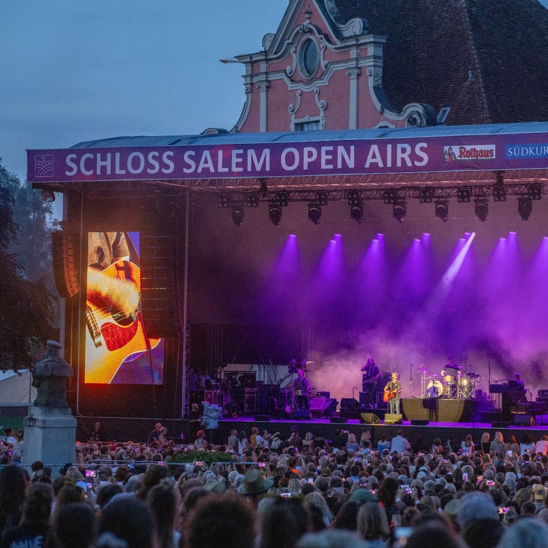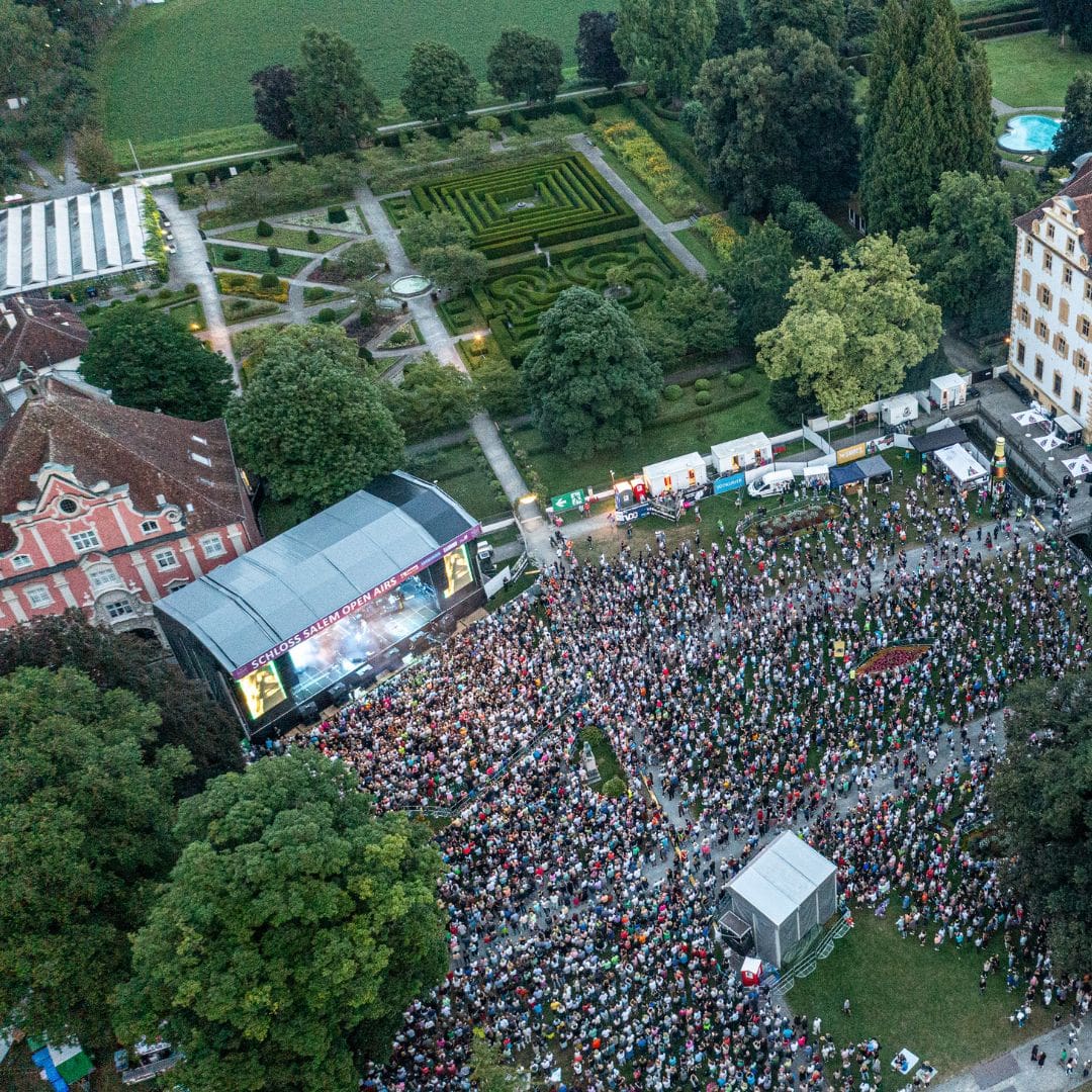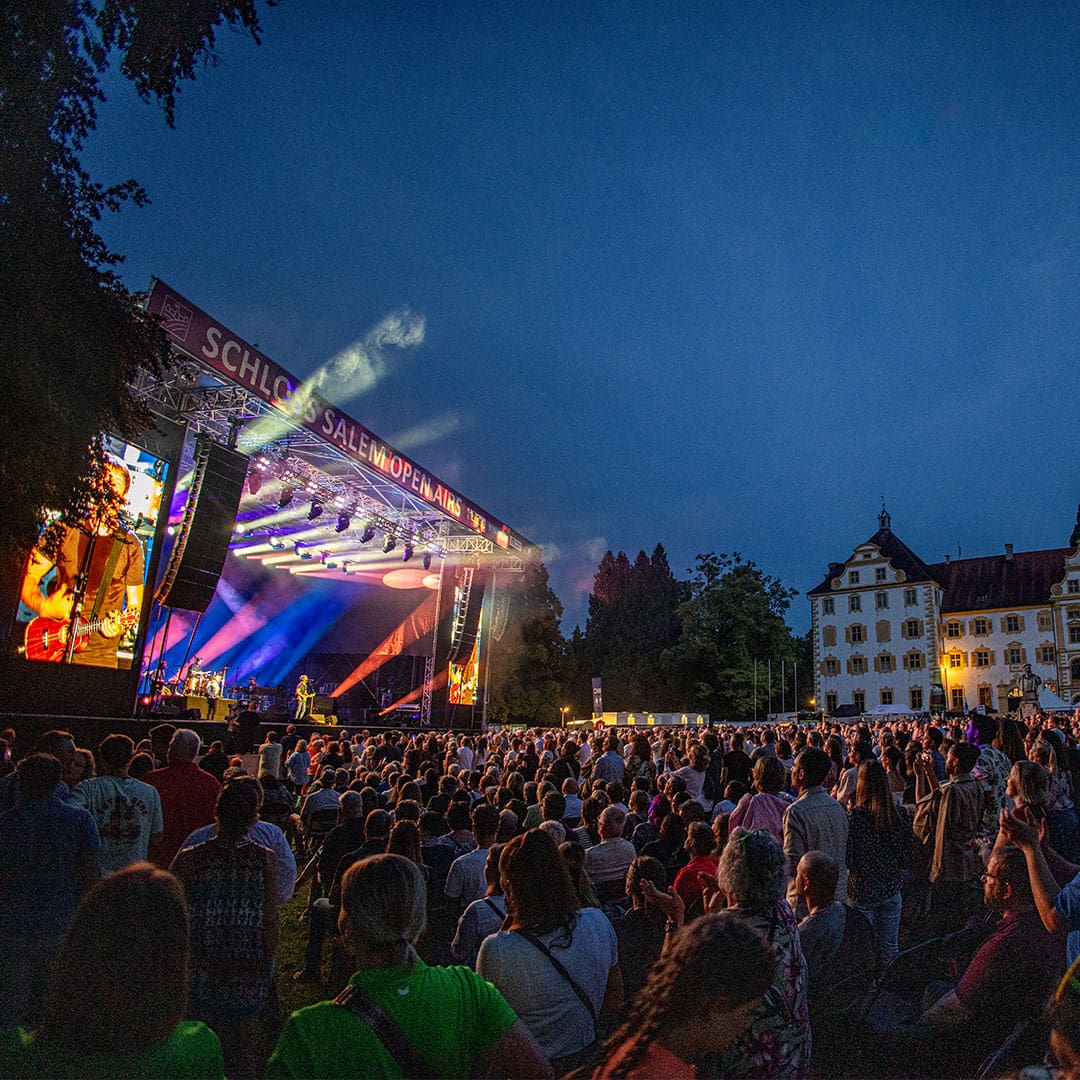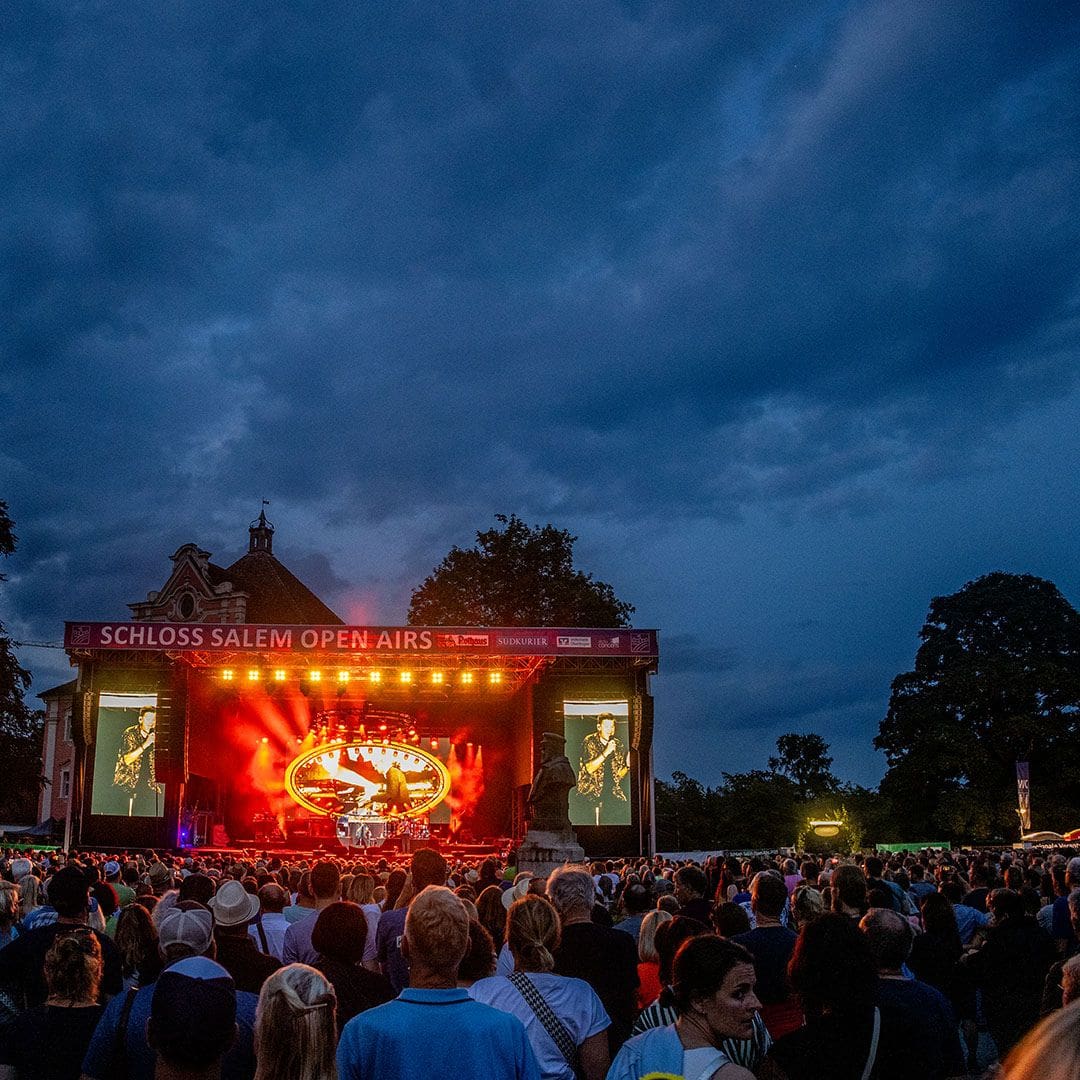 Kaum eine andere Open Air Location besticht mit solch einem magischen Ambiente wie die Schloss Salem Open Airs. Bereits seit 2005 ist die beliebte Open Air Veranstaltungsreihe ein absolutes Highlight für alle Musikfans. Jedes Jahr organisieren wir auf Schloss Salem vier Konzerte mit wechselndem Programm und nationalen sowie internationalen Künstler:innen. Die Schloss Salem Open Airs sind mittlerweile eine fest etablierte Konzertreihe, die mit ihrer romantisch-historischen Kulisse auf einzigartige Weise moderne Kultur mit dem Lebensgefühl der vergangenen Jahrhunderte verbindet. Dies zieht nicht nur Musikliebhabende und Besucher:innen aus der unmittelbaren Umgebung an, sondern auch Konzertbesucher aus der angrenzenden Schweiz, Österreich und anderen Teilen Deutschlands sind von der außergewöhnlichen Atmosphäre des Salemer Schlossgartens begeistert.